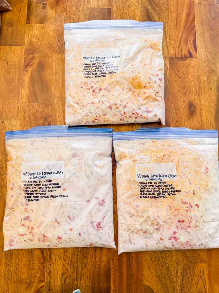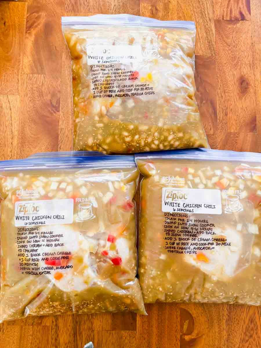 After assembling the bags, remove excess air. To save space, store flat in the freezer. I recommend freezing on top of a baking sheet so the bags don’t go through the wires. Add parchment paper between stacked bags so they don’t freeze together as well. As a rule of thumb, properly stored foods will last for about 3 months in the freeze or 6 months in a deep freezer.