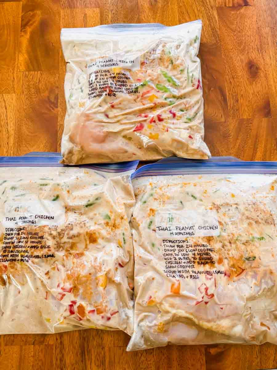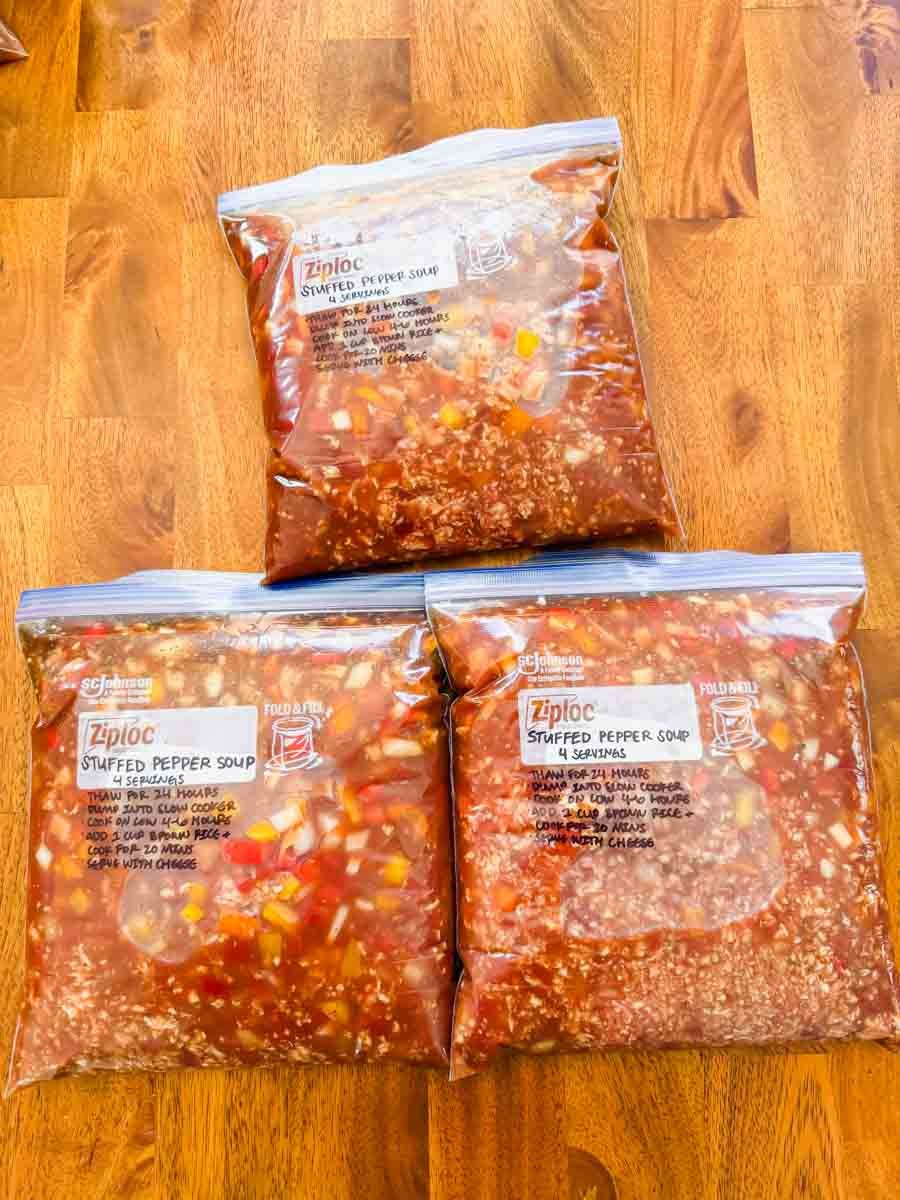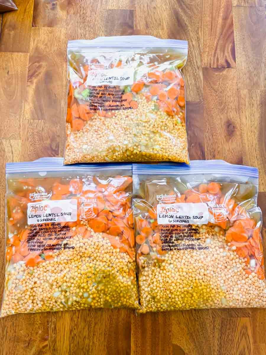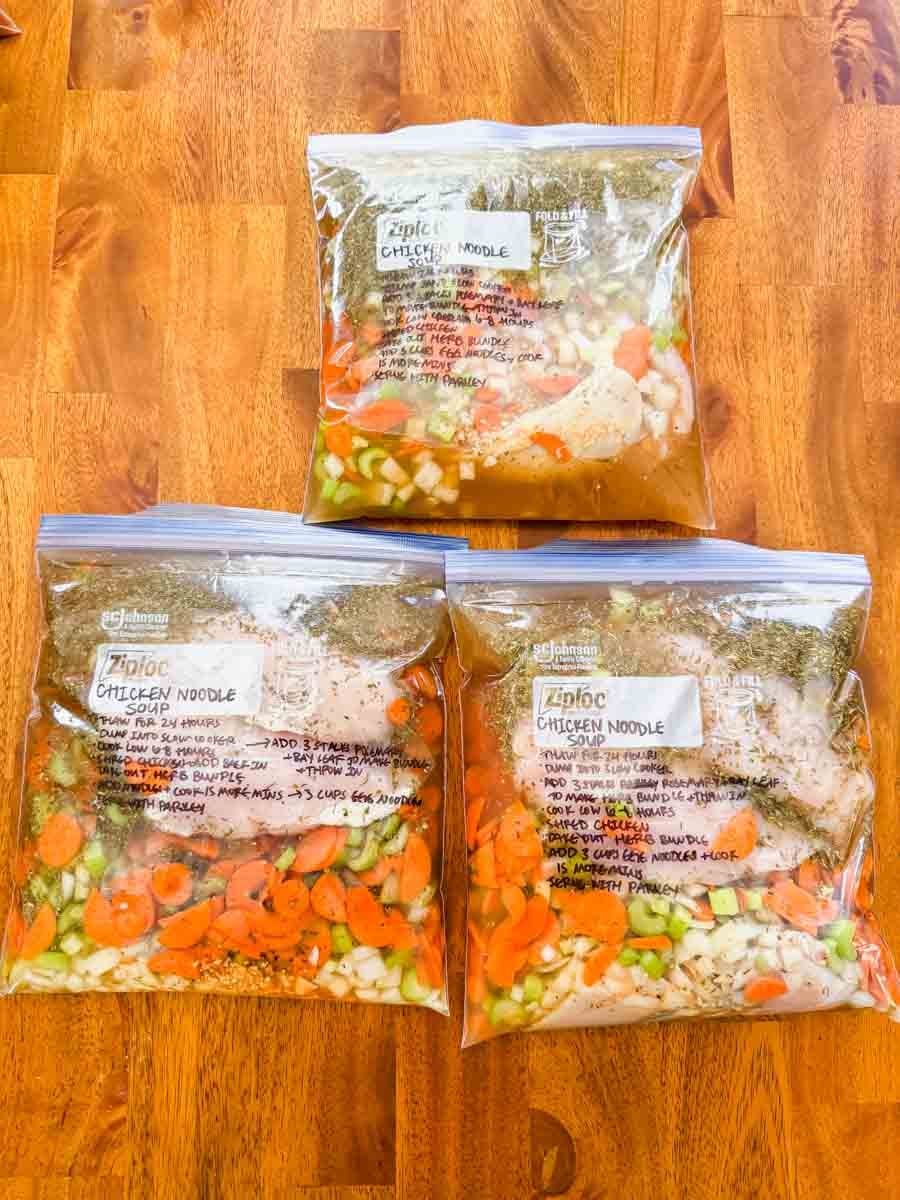 - Assemble freezer bags. Follow the instructions and list of ingredients for each recipe. Remove excess air and store flat in the freezer. Add parchment paper between stacked bags so they don’t freeze together.